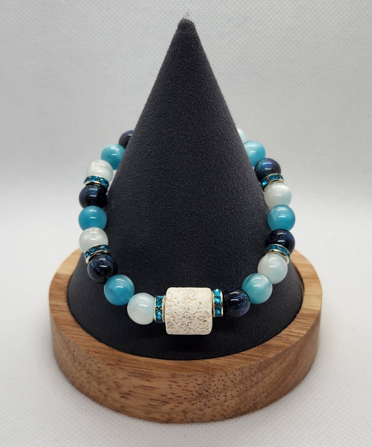 7.5 inches. This is a beachy bracelt with some blue rhinestone spacers and a coral look barrel shaped bead.